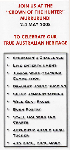 Enjoy our true blue bush festival over the three days.,' We have organised this festival to make sure that everyone has the best time possible both day and night in beautiful Murrurundi, the Crown of the Hunter. We certainly look forward to a great event and festival and wish all competitor's the best of luck during the, challenge.